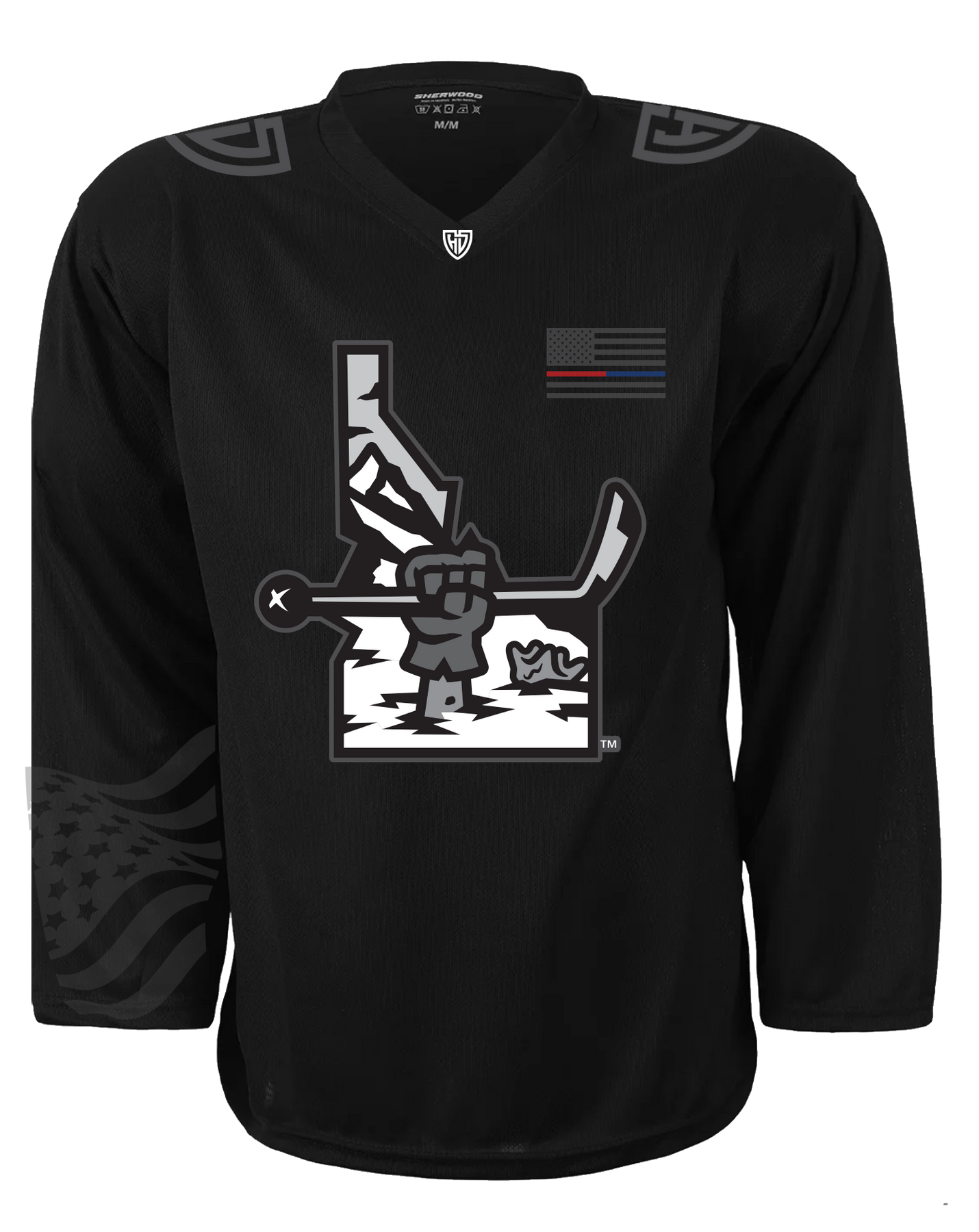 Game-quality blackout jersey built to the same specs worn on the ice. This limited edition run directly funds Heroes Defense programs supporting first responders across Idaho and beyond.